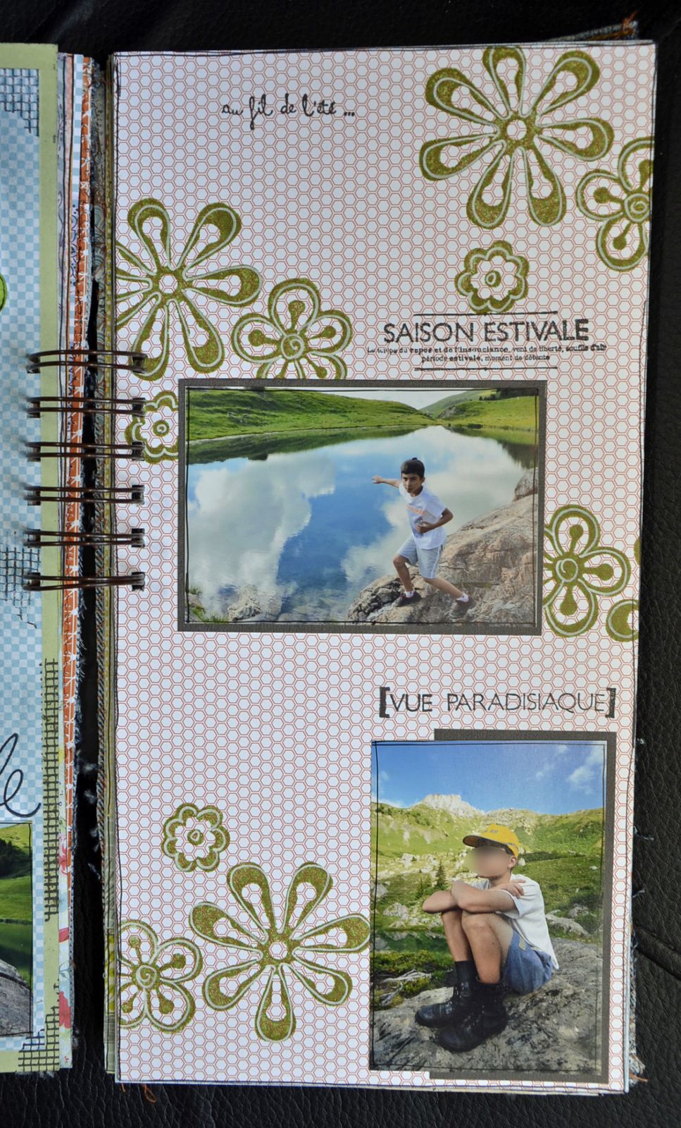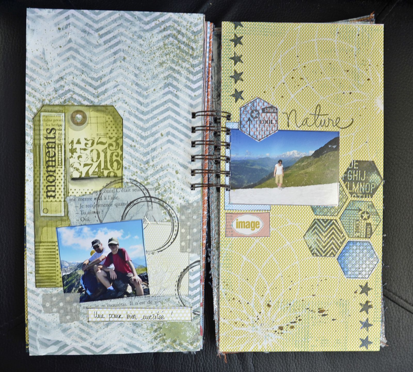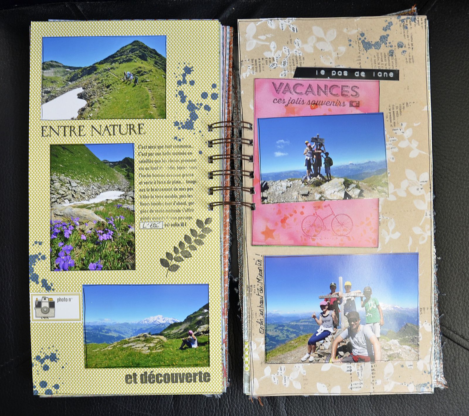 Tout ça pour vous dire que je viens de terminer un album 30 x 15 cm sur nos vacances à la montagne. Il a été réalisé avec la collection de papier 'Happy Days' de Docrafts et quelques pschitt par-ci par-là !